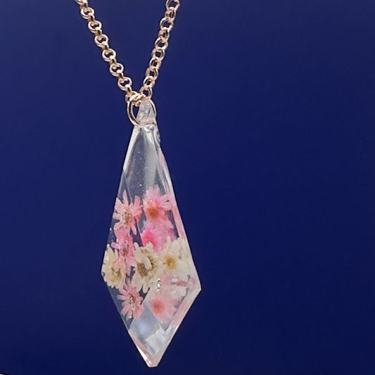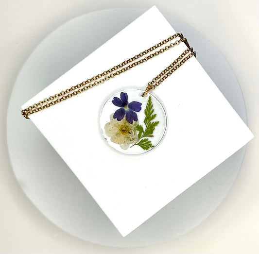 Gorgeous white and dark blue pressed flower necklace